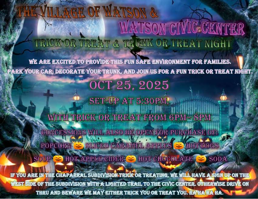 Trunk or Treat at the Watson Civic Center will start at 5:30PM Concessions will be open in the WACO Building. We take Cash and Venmo.