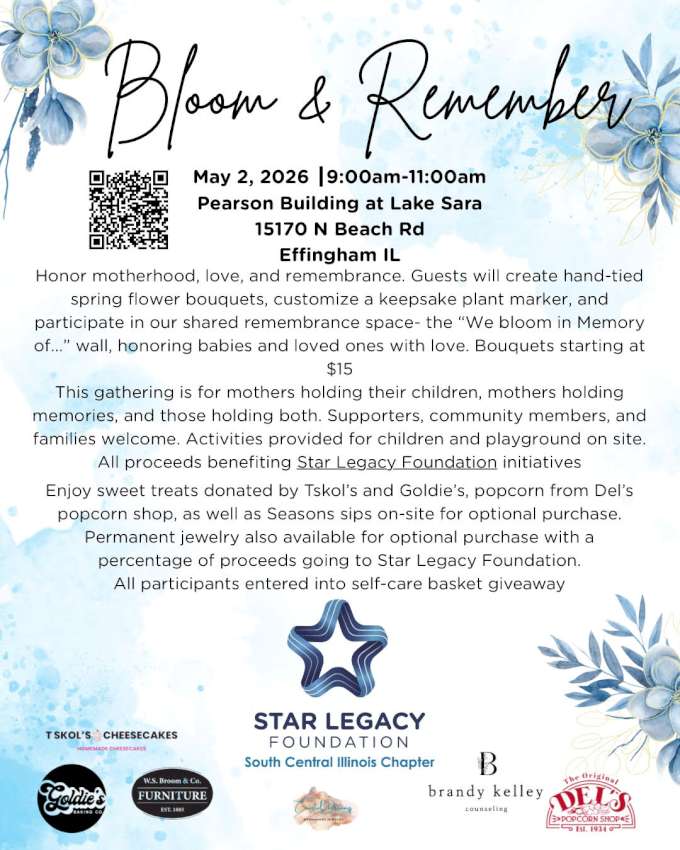 The Star Legacy Foundation is hosting the Bloom & Remember Event on Saturday, May 2.  The gathering will be from 9:00 AM – 11:00 AM in the Pearson Building at Lake Sara, located at 15170 North Beach Road, Effingham.